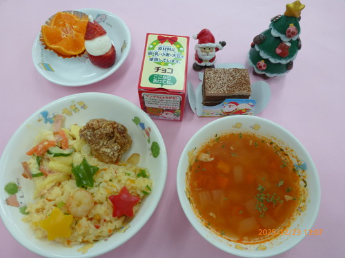 ★【お誕生会】エビフライ・鶏の唐揚げ・カリフラワーサラダ・ミネストローネ・いちご・みかん