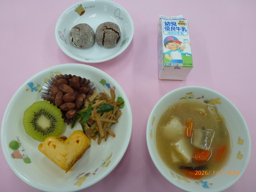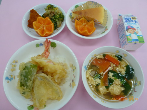 🎂【お誕生会】天丼・ブロッコリーのごま和え・南瓜含め煮・しめたま汁・みかん