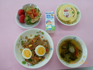 🎂【お誕生会】ガパオライス・春雨と胡瓜の和え物・若布コーンスープ・ミニトマト・いちご