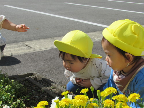 お散歩遠足①0・1・2歳児で竹駒神社駐車場まで散歩に行きました