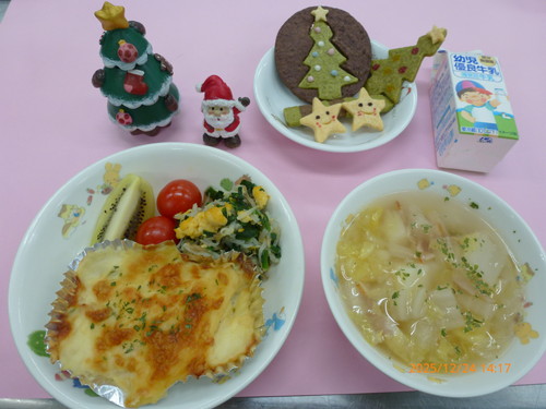 🎄【クリスマスイブ】マカロニグラタン・三色ソテー・ベーコンスープ・キウィフルーツ・ミニトマト