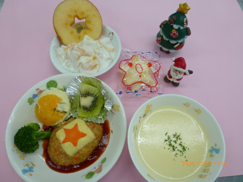 🎄【クリスマス】チーズハンバーグ・ポテトサラダ・茹でブロッコリー・コーンポタージュ・キウィフルーツ