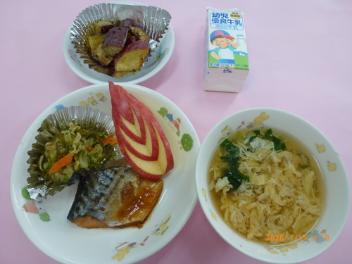 🍰【給食】五目ぶかし・魚の照り焼き・青菜和え・しめたま汁・りんご・十五夜デザート
