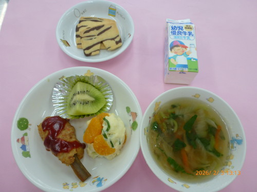 ★【給食】鶏のから揚げ・オーロラサラダ・かぶのみそ汁・ミニトマト